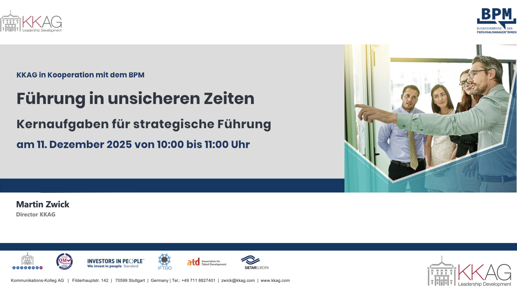 Genau hier setzen wir an. Gemeinsam unserem geschätzten Partner Bundesverband der Personalmanager:innen (BPM) betrachten wir die wichtigsten Einflussfaktoren der aktuellen Situation und zeigen auf, welche TOP 6 Kernaufgaben strategischer Führung sich in der Praxis bewährt haben – und wie Sie diese gezielt in Ihre PE-Strategien integrieren können.
