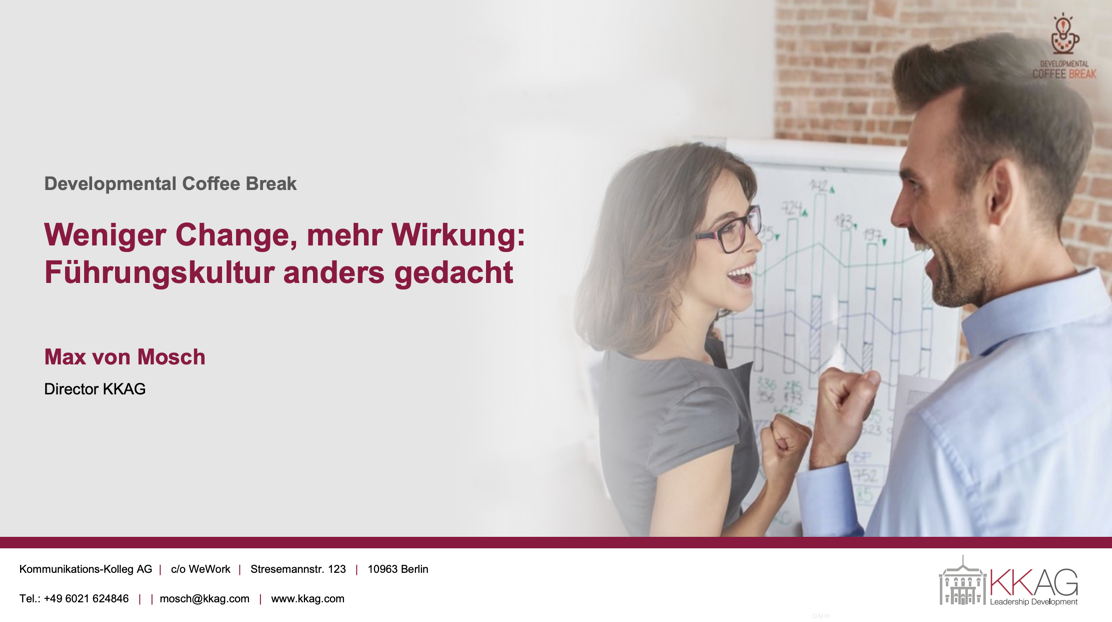 In diesem Developmental Coffee Break werfen wir einen etwas anderen Blick auf das Thema Kulturentwicklung – und zeigen, mit welchen Hebeln und Reflexionsformaten Sie die Führungskultur Ihrer Organisation wirksam in Bewegung bringen können.